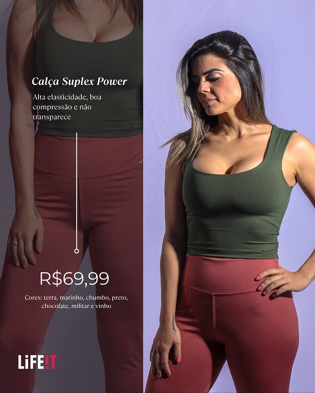 Uma empresa que cresce cada dia mais, pois possui peças de excelente qualidade. Confeccionadas em tecidos da mais alta qualidade do mercado, com toque macio e ótima elasticidade, o que garante maior conforto durante o treino, e possuem ótimos acabamentos, além de contar com uma excelente modelagem, que valoriza o corpo da mulher!